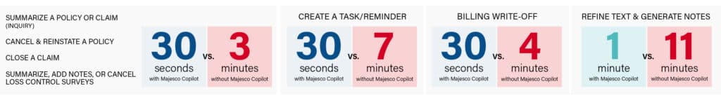 Majesco Copilot amplifies your staff’s abilities by bending the learning curve, supporting decision-making, and increasing productivity, slashing the time it takes to complete common tasks all by using simple queries.