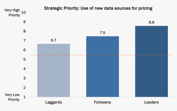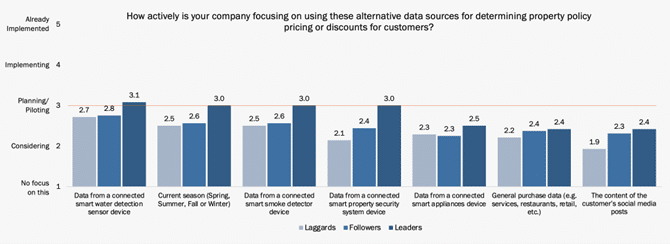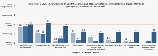 One way is to use new, innovative data sources from a customer to assess their specific risk, which can be used for personalized pricing. In Figure 1, all three segments (Laggards, Followers and Leaders) recognize the importance of using new data sources; however, Leaders outpace Laggards by 28% and Followers by 15% in terms of priority and likely execution.