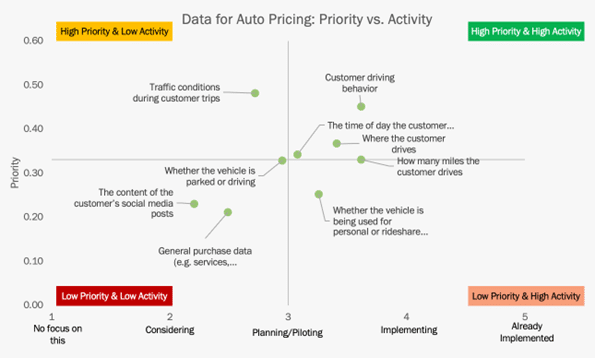 Adoption of connected vehicle data and telematics for auto insurance pricing is growing, with leading insurers taking a proactive stance in leveraging real-time driving data. Customer driving behavior, where and when the customer drives, and the number of miles driven all represent high priority and high activity, as shown in Figure 2. Other driving-related data categories are not far behind, but non-driving sources, such as social media posts and general purchase data, show low priority and low activity.