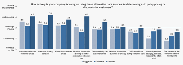When comparing the three insurer segments, Leaders are well above or hovering close to the Planning/Piloting phase in all auto pricing data sources, with nearly 5 of them in the implementation stage. Competitively, they outpace Followers and Laggards in five of the seven driving-related categories, putting them at a great advantage given the growth in customers choosing telematics.