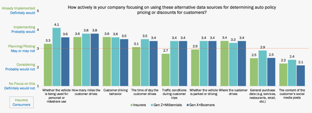 Our consumer and SMB research found that both Gen Z & Millennials and Gen X & Boomers are incredibly open to the use of personal data sources for their driving from telematics and connected devices to obtain a personalized rate. This includes miles driven, driving behavior, the time of day they drive, traffic conditions, whether the car is driving or parked, and where they drive, as shown in Figures 4 and 5.