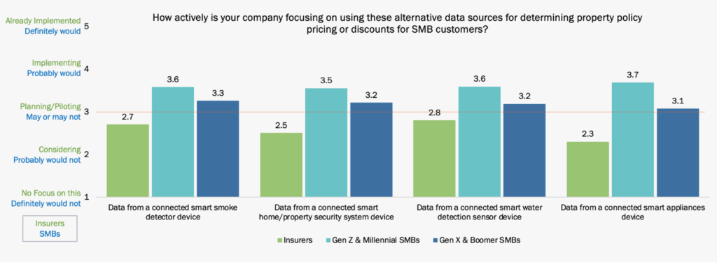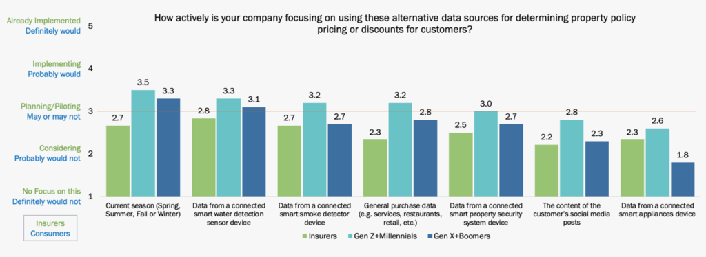 While we expect this interest from Gen Z & Millennials, the older generation’s acceptance is equally high, evidence of the rapid increase in use and acceptance of digital devices by all generations, highlighting the need for insurers to accelerate their use of connected and telematic devices for property.