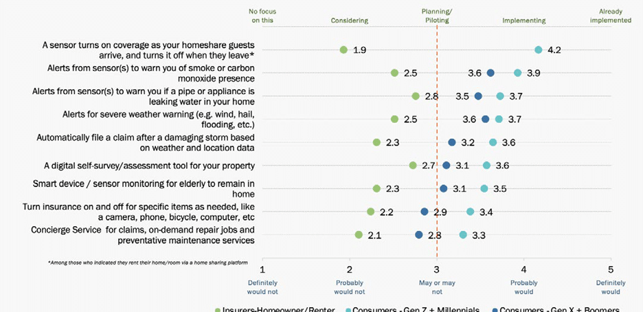 In our consumer research, we see a generational alignment in value-added services in the homeowner/renter insurance space, likely driven by their top-of-mind issues (Figure 2). Customers value safety and peace of mind from alerts and monitoring devices/services like smoke/CO and water leak sensors, home monitoring for elderly family members, and severe weather alerts. These offerings have among the highest levels of interest for both generational segments.
