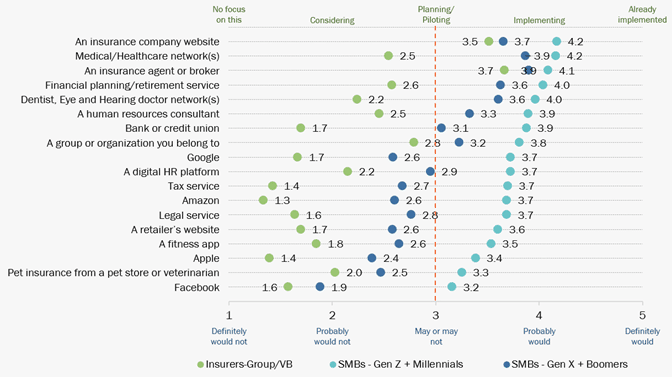 Today’s buyers still look to agents and brokers, but will look to buy insurance through other channels or entities as well, as reflected in Figure 3. SMBs are leveraging other trusted and loyal relationships that make buying insurance through them relevant, particularly for the Millennial and Gen Z SMB owners.