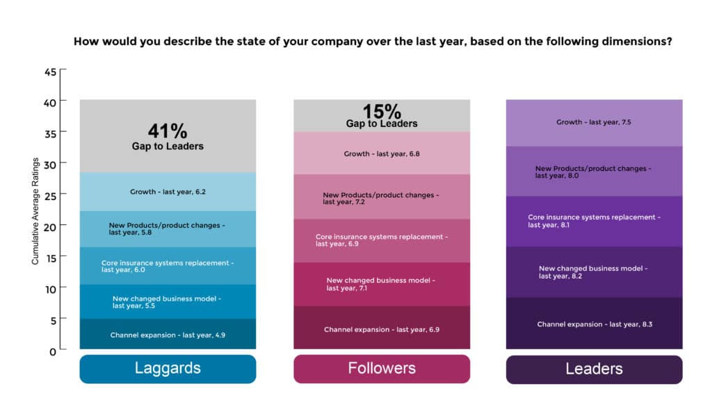 Compared to last year, Leaders’ understanding of internal challenges increased by nearly 15 points, increasing the gaps between them and Followers and Laggards. These challenges include areas such as Innovation, Legacy System Replacement, Increasing Competition from Traditional Competitors and New Competition from InsurTechs, as well as New Regulatory Requirements.