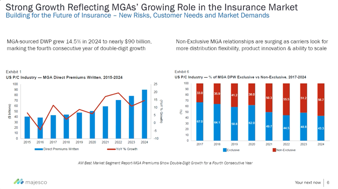 MGAs continue to have a growing role in the insurance market because, in many cases, they are unhindered in their ability to look at new, different risks and be able to assess those risks and underwrite those risks and bring products to market. Direct Written Premiums for MGAs grew by almost 15% in 2024. It is interesting that non-exclusive relationships with insurers are also growing. More MGAs are choosing to work with multiple insurers, rather than exclusively with only one insurer.