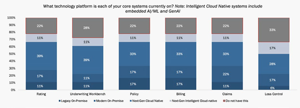 Only about 45% of the MGA’s have cloud native or modern next-gen core systems with a lot of legacy. Those that probably don’t even have a core system may be using spreadsheets; they may be using agency management systems, etc.